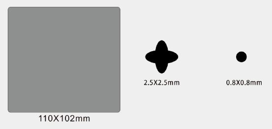 1.此背景为音箱网孔,背景面积110X102mm。基础单元两个,星形和圆形,计划以冲压铝合金成型,因此星形2.5X2.5mm,圆孔0.8X0.8mm保证冲压凸模不断裂,如下图21所示。
